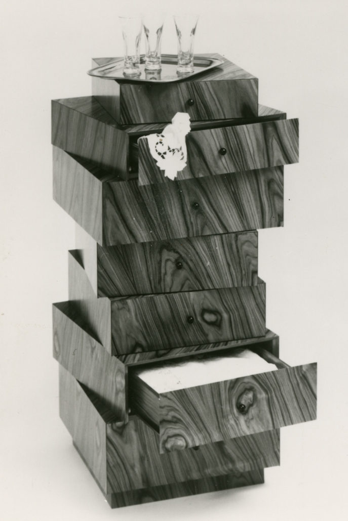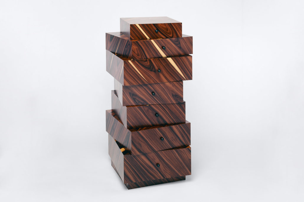 Der Schubladenstapel entstand nach einem Besuch des Zürcher Brockenhauses und nach den dort in einem Zwischenlager zufällig aufeinandergestapelten Schubladen. Reduziert auf die eigentliche Funktion einer Kommode wurden so – der Name verrät es schon – einfach Schubladen aufeinandergestapelt. Die sieben schräg angeordneten Elemente werden durch die Materialwahl von wild gemustertem Palisanderholz wieder zu einem Ganzen zusammengeführt. Durch die sorgfältige Verarbeitung des auf Gehrung verarbeiteten Furniers bekommt der Schubladenstock ein edles Finish. Das Möbel wird noch heute gut verkauft und wurde von einigen namhaften Sammlungen im In- und Ausland angekauft.